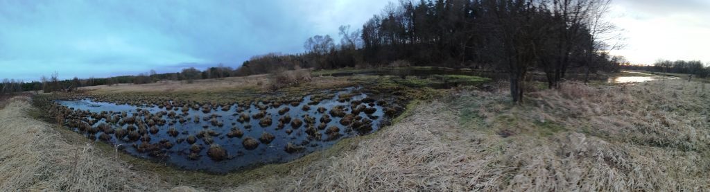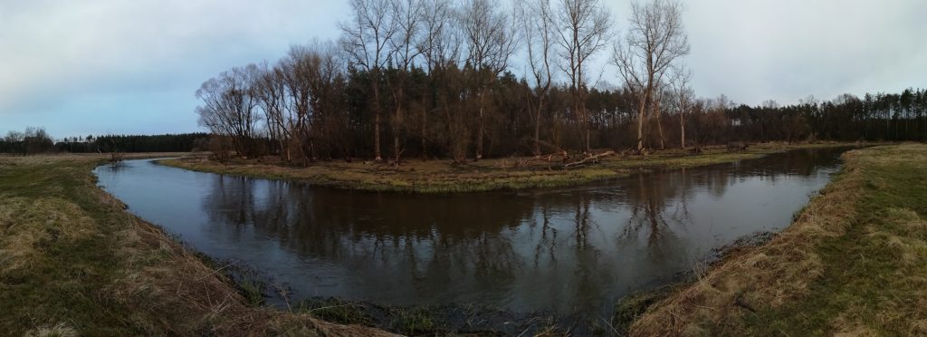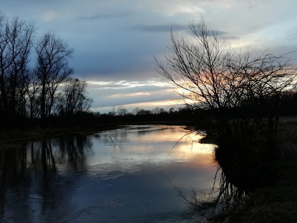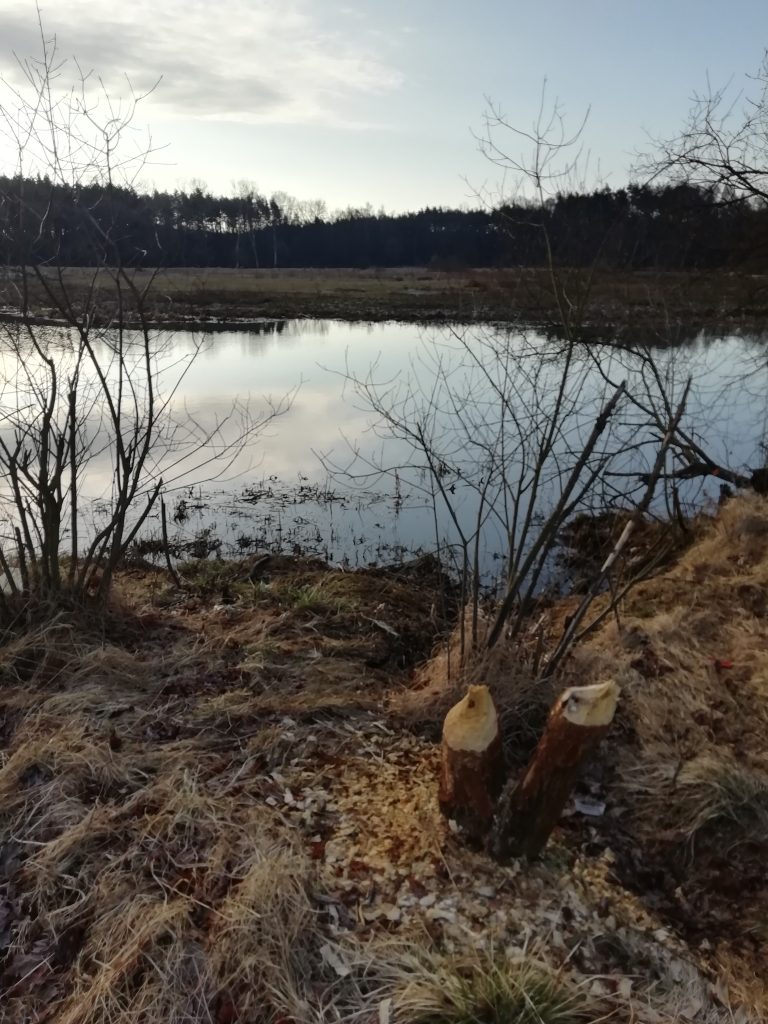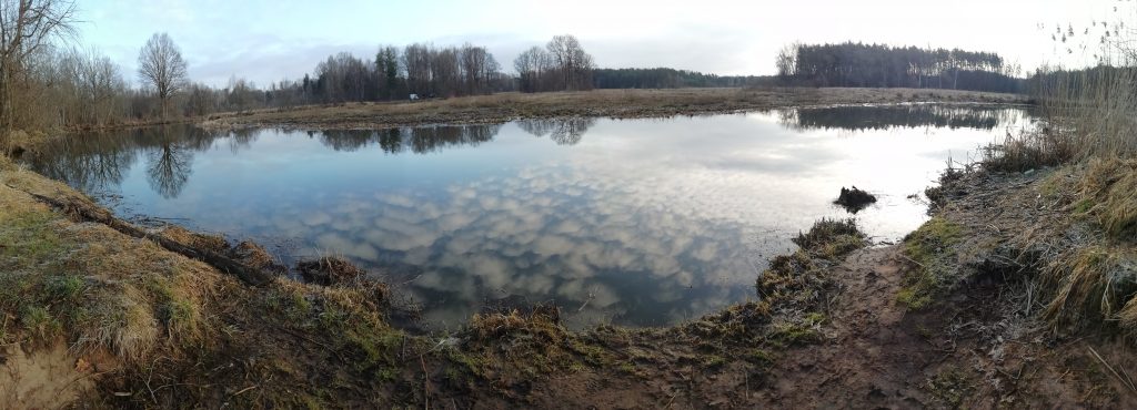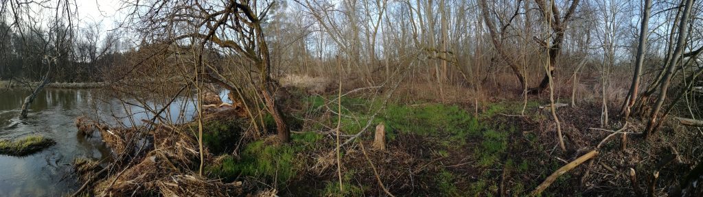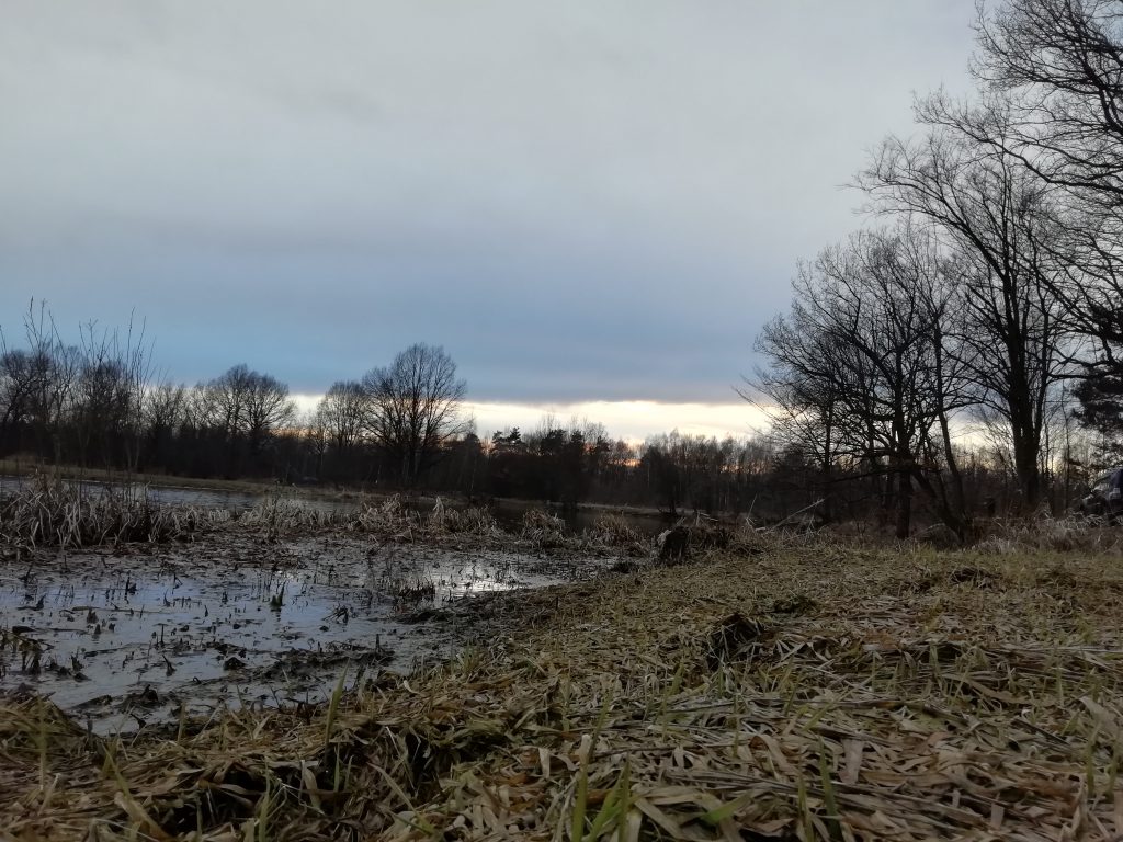 Nowy dzień wita nas chłodem. Jest pogodnie lecz zimno. Dziś udaję się na zachodni brzeg starorzecza pokryty lasem łęgowym. Słoneczne niebo z cirrocumulusami odbiją się w stojącej wodzie. Brzegi pokryte zgryzami niczym średniowieczne grody otoczone zaostrzonymi palami. Między nimi pojedyncze zawilce podnoszą nieśmiało po zimnej nocy kwiaty ku górze. Spłoszone moimi krokami kaczki krzyżówki wzbijają się w powietrze. Po drugiej stronie Warty słychać dzięcioła. Otacza mnie piękna dzika przyroda skalana śladami człowieka takimi jak butelki i inne śmieci…