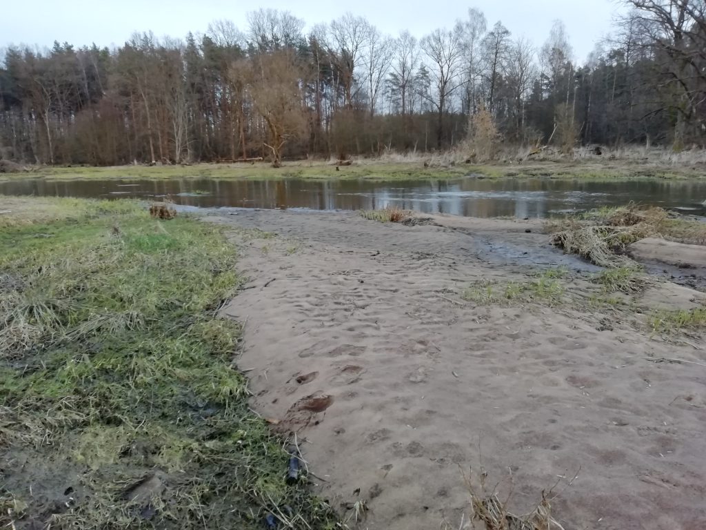 Idąc na południe z biegiem rzeki dochodzimy do małej plaży. Jest to miejsce między aktualnym i dawnym korytem. Schodząc ze ścieżki należy uważać, gdyż teren jest miejscami podmokły. Woda często ukryta jest pod zeszłorocznymi pozostałościami traw i innych roślin. Marzec jednak nie sprzyja obserwacjom botanicznym. O swym istnieniu przypominają jedynie kolczaste jeżyny wbijające się w spodnie i nogi. Pod wieczór można podziwiać zachód słońca wsłuchując się w odgłosy licznych ptaków kryjących się zaroślach.