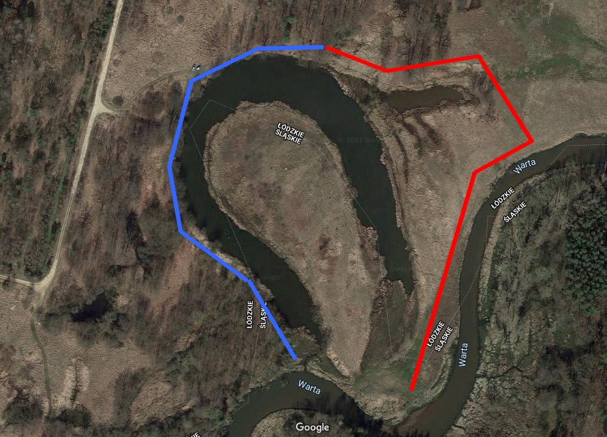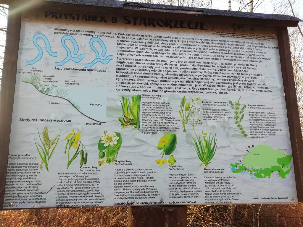 Naszym miejscem docelowym jest ósmy przystanek. Wita nas tablica informacyjna ścieżki przyrodniczej. Dzięki niej można zapoznać się z etapami powstawania starorzeczy, budową strefową jeziora i roślinnością porastającą to miejsce. Północny brzeg zajmuje niewielki fragment lasu grądowego, w którym będziemy nocować. Kierując się na wschód trafiamy na podmokły teren. Trzeba ominąć te obszary łukiem, przechodząc przez otwarty teren częściowo odgrodzony drutem. W oddali po lewej stronie można dostrzec ambonę. Przed nami aktualny bieg Warty. Po drugiej stronie zakola znajduje się miejsce żerowania Bobrów w postaci licznych zgryzów.