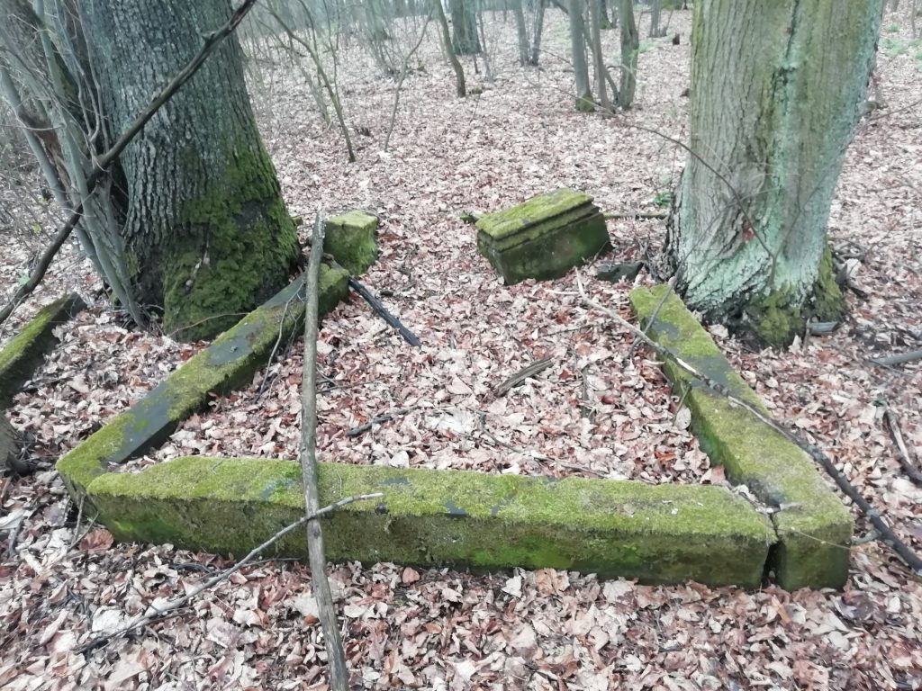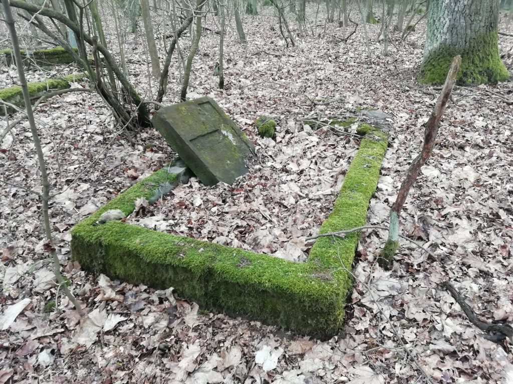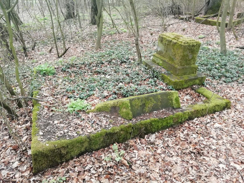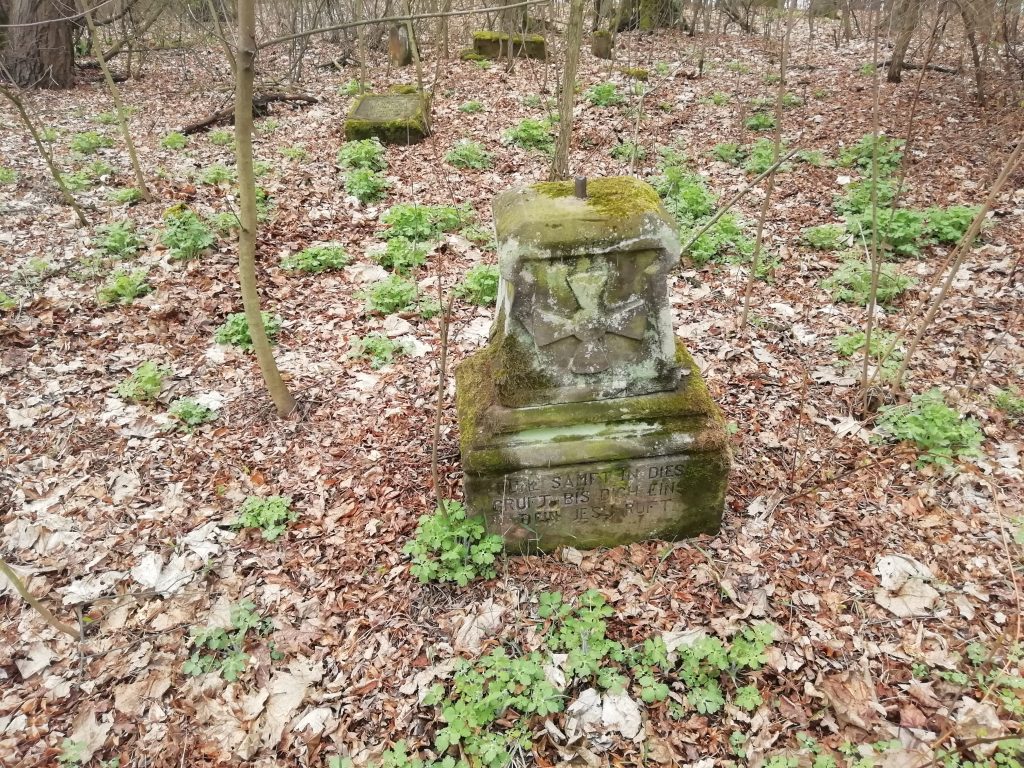Znajdujemy również kilka nagrobków z napisami w języku niemieckim z pierwszej połowy XX wieku. Na szczycie jednego prostokątnego cokołu widać ślad po uciętym krzyżu. Na dole widnieje porośnięta mchem inskrypcja „RUHE SANFT IN DIESER GRUFT BIS DICH EINST DEINE JESU RUFT”, znacząca „Odpoczywaj spokojnie w tym grobie, aż twój Jezus do ciebie nie zawoła”.