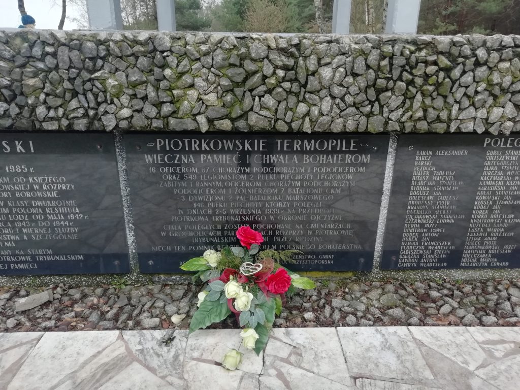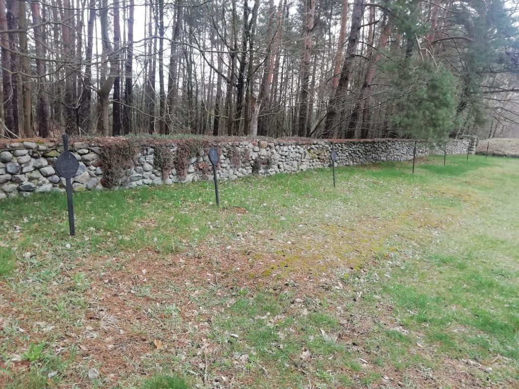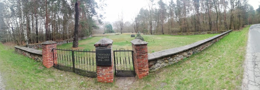 Po ujrzeniu cmentarza (51.322735, 19.487762) z zewnątrz wydaje się dość pusty. Nie spodziewamy się, że jest tak duży. Przekraczając furtkę zaczyna się czuć powagę tego miejsca. Po bokach rzędy metalowych słupków z tabliczkami informującymi o poległych a przed nami wielkie kopce – zbiorowe mogiły.