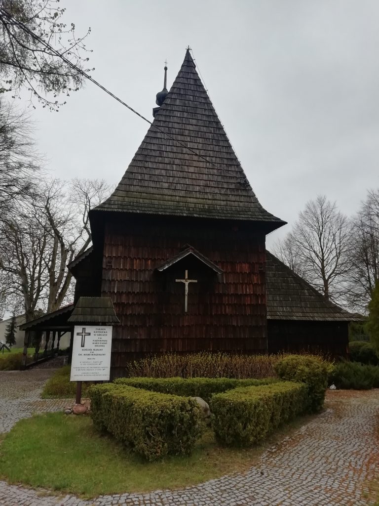 „Najstarszy, jednonawowy, modrzewiowy kościół o konstrukcji zrębowej, niegdyś parafialny wzniesiono na przełomie XV i XVI w.  Kościół posiada wysoki, dwuspadowy dach pokryty gontem i sygnaturkę na szczycie, ściany kościoła również pokryte są szalunkiem z gontu. Obecny również drewniany kościół pw. św. Marii Magdaleny jest już prawdopodobnie trzecim zbudowanym na tym samym miejscu. Został przebudowany w 1659 r., remontowany w latach 1765–1769. Kruchta została dobudowana w 1769 r., a zakrystia w 1848 r. W 1888 r. parafia przeniosła się do kościoła pokartuskiego. Dopiero w 1921 r. staraniem ks. Adama Buchowskiego drewniany kościół odrestaurowano.” (źródło)