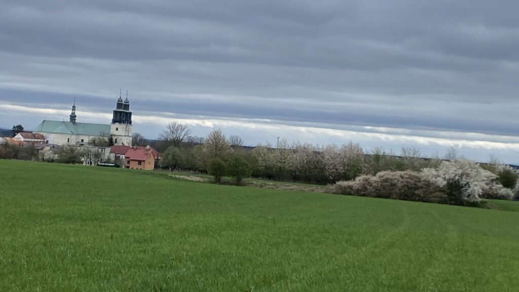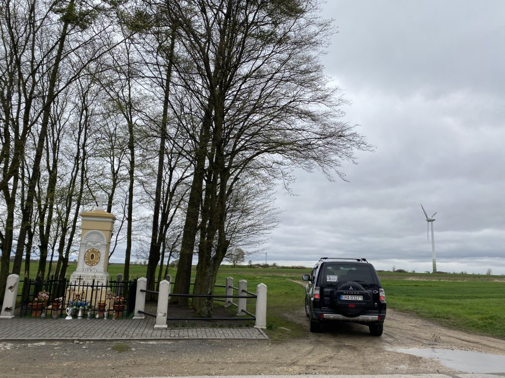 Ostatnim punktem dzisiejszej wycieczki jest znajdująca się niedaleko Kapliczka Matki Boskiej Gidelskiej. Upamiętnia ona koronację Cudownej Figurki Matki Bożej Gidelskiej w 1923 roku. Skręcamy tu w polną, grząską drogę, gdzie ukazuje się nam piękny widok Sanktuarium i kwitnących drzew na tle zielonych pól. Po drugiej stronie między drzewkami przebiega kilka saren. Buksując bo błocie udaje się wjechać na utwardzoną drogę, przy której stoi wiatrak. Teraz już prosto do domu.