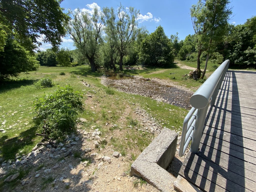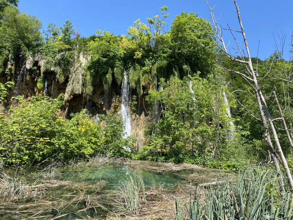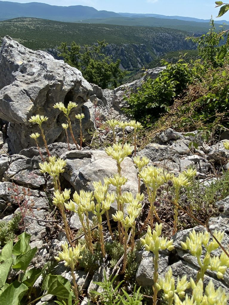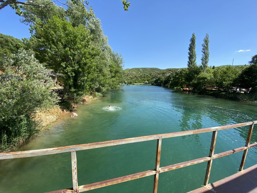 W dół prowadzi ścieżka prowadząca do kamiennego mostu przy wodospadach. Jest tam też huśtawka, z której można skakać do wody. Na sam spacer trzeba jednak zarezerwować przynajmniej 2 godziny. Po zejściu pewnie chciałoby też się pobyć trochę nad wodą. Niestety czas nas goni. Na skalnej ławce zjadamy kanapki, oddychając nagrzanym i aromatycznym powietrzem, w otoczeniu nielicznej lecz ciekawej roślinności, takiej jak picnomon acarna czy rozchodnik lancetowaty.
