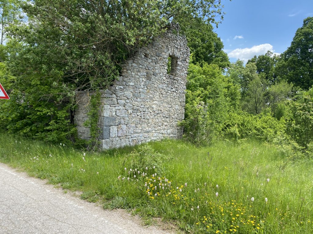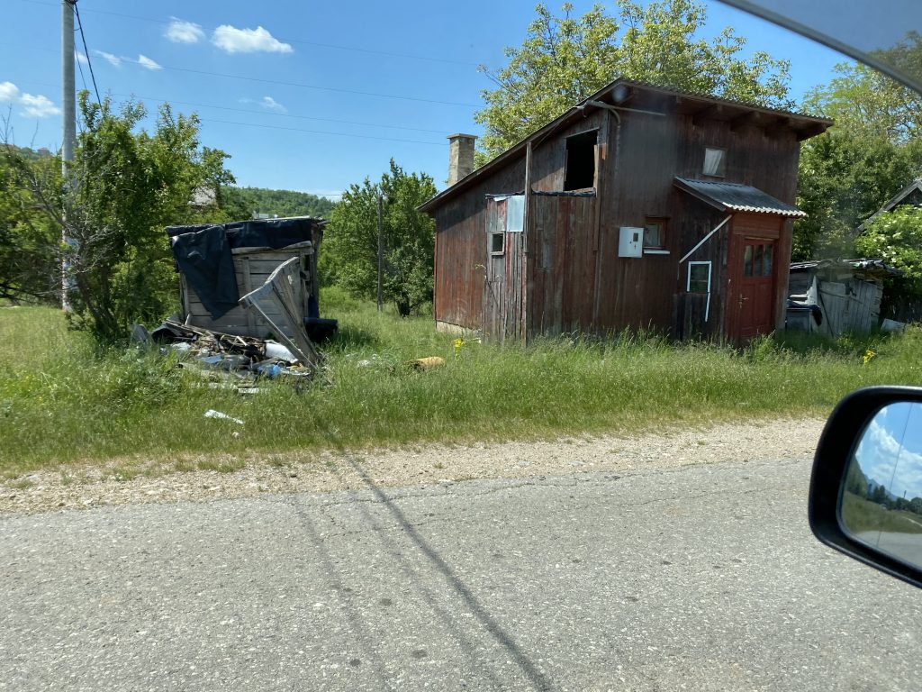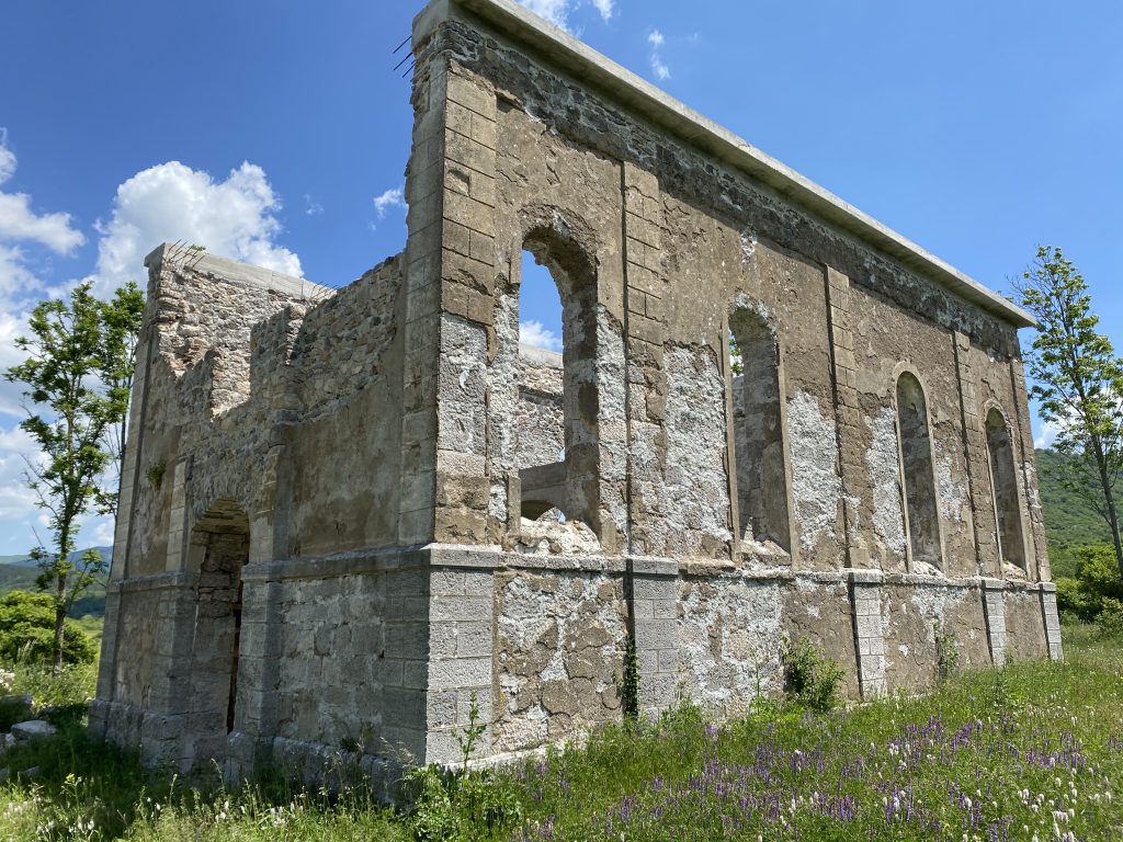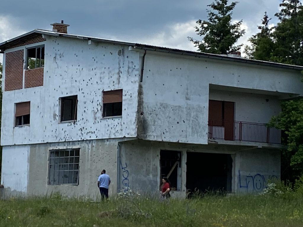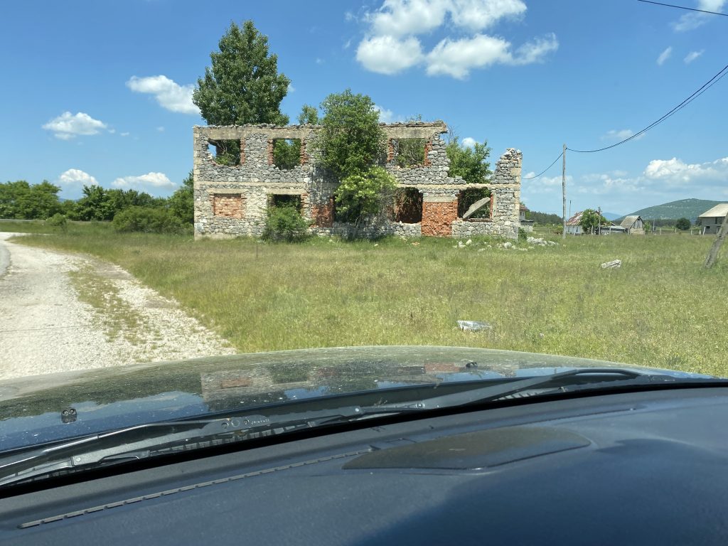 Kolejnym szukanym obiektem jest kościół Narodzenia św. Jana Chrzciciela we wsi Bruvno. Jest tu wiele ruin i opuszczonych (albo i nie) budynków, lecz nie kościół. Być może kryje się gdzieś za drzewami. Panuje tu dziwna atmosfera, trochę jak z horroru. Rezygnujemy z poszukiwań. I znów trafiamy na kolejne ślady po wojnie, tym razem zostawione przez pociski na budynku.
