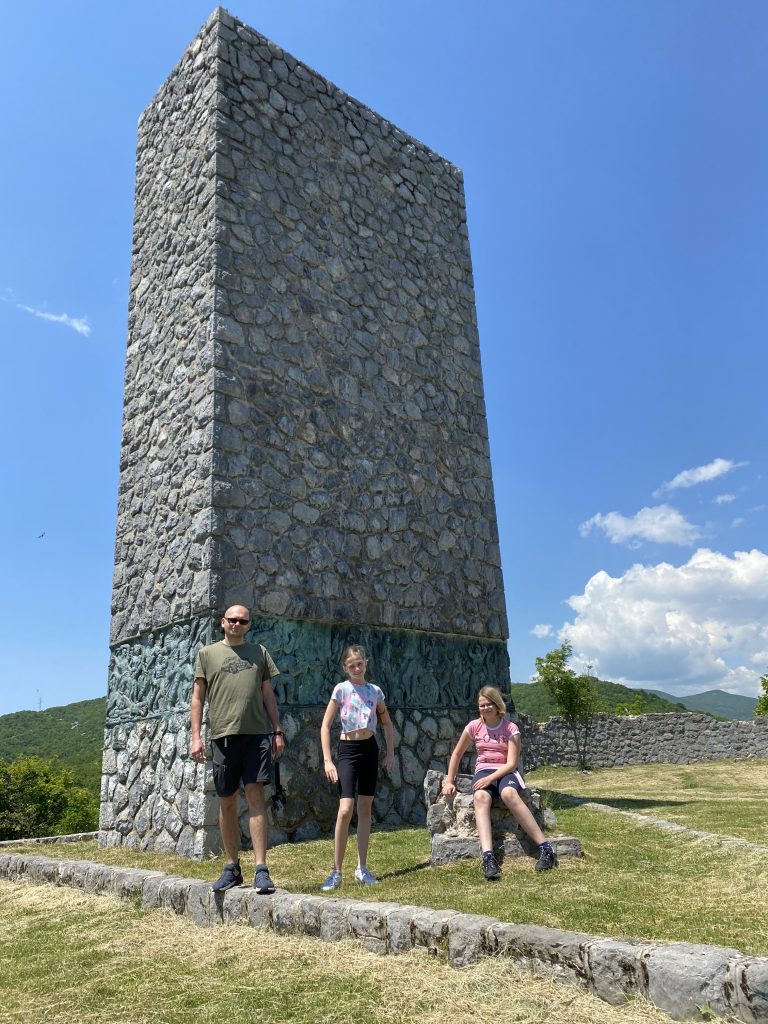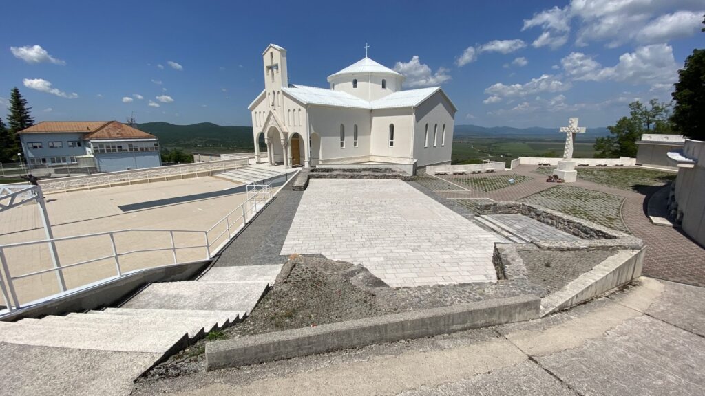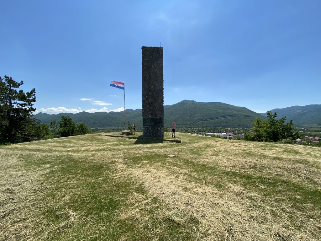 Jesteśmy we wsi Gračac. Mijamy betonowe krzyże wystające między trawami na przydrożnej łące. Zatrzymujemy się u podnóża grobli, nieopodal kościoła św. Jerzego Męczennika. Na szczycie góruje chorwacka flaga i monument opasany płaskorzeźbą przedstawiającą walki.