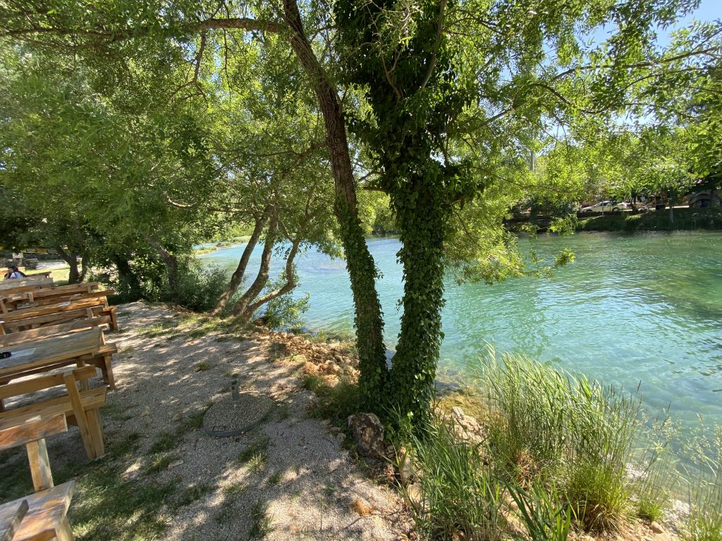 Na miejscu zastajemy kilka budynków, w tym bar i restaurację nad rzeką. Kilka osób się kąpie, pływa, niektóre skaczą do wody. Kawałek dalej znajdują się wodospady i mała plaża.